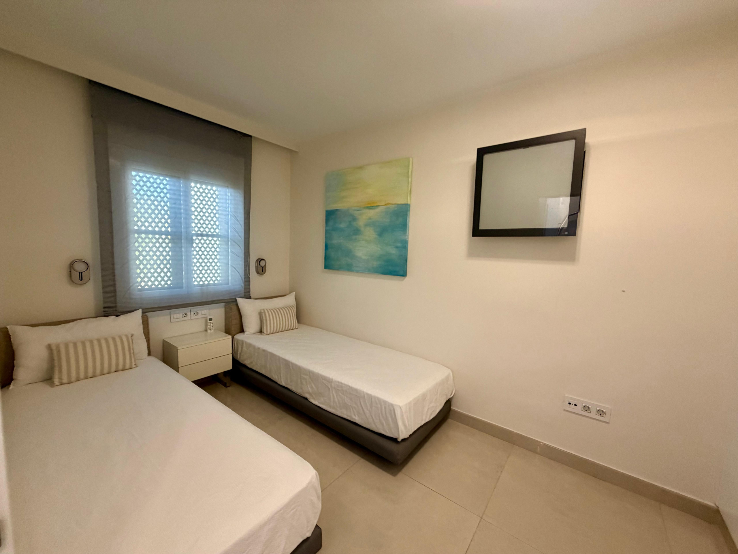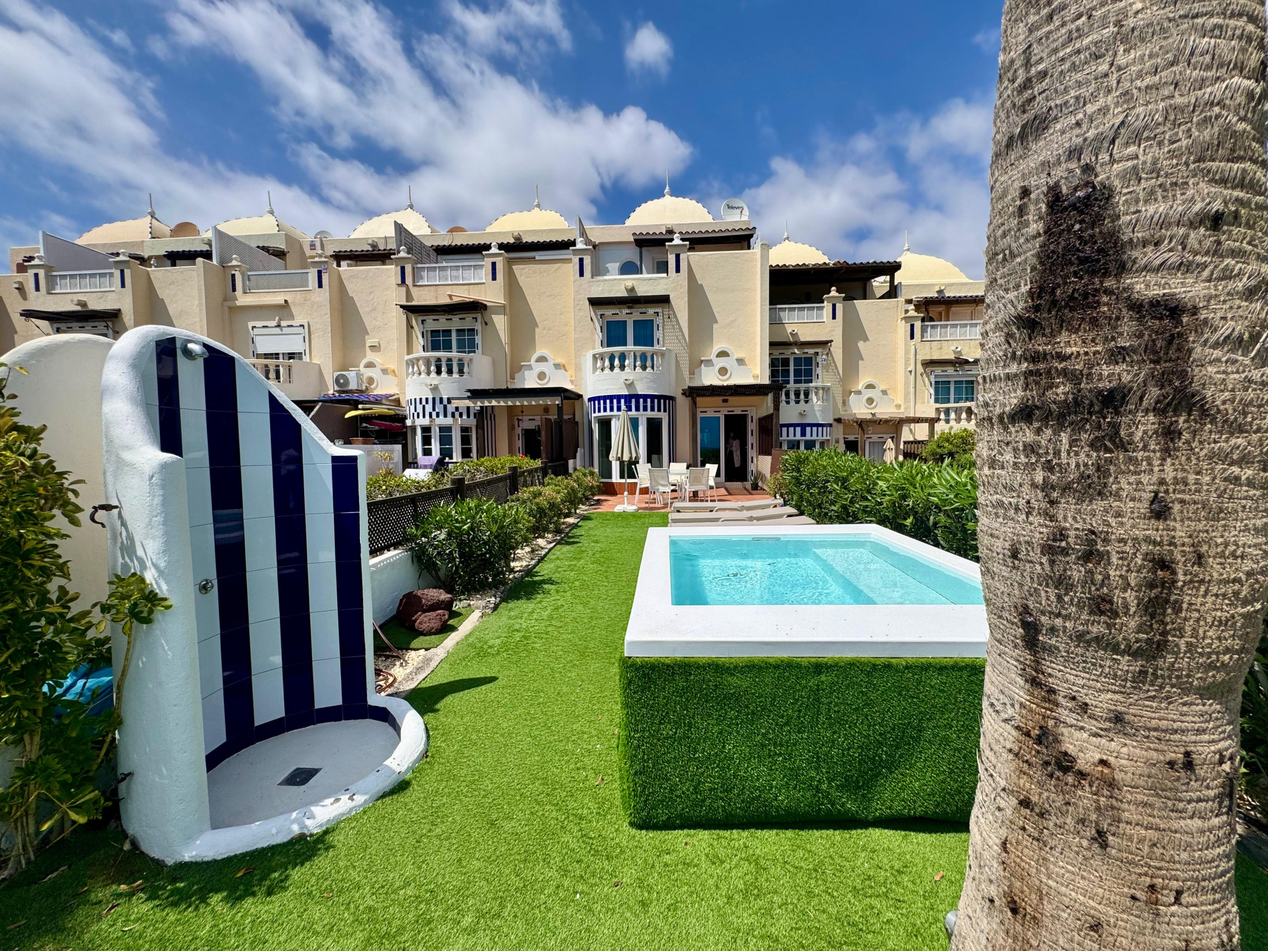 Dispone de jardín, mobiliario jardín, parcela vallada, 50 m² de terraza, lavadora, plancha, acceso internet (wifi), secador, balcón, aire acondicionado en todo el alojamiento, piscina privada, parking aire libre en mismo edificio, 3 Televisores.