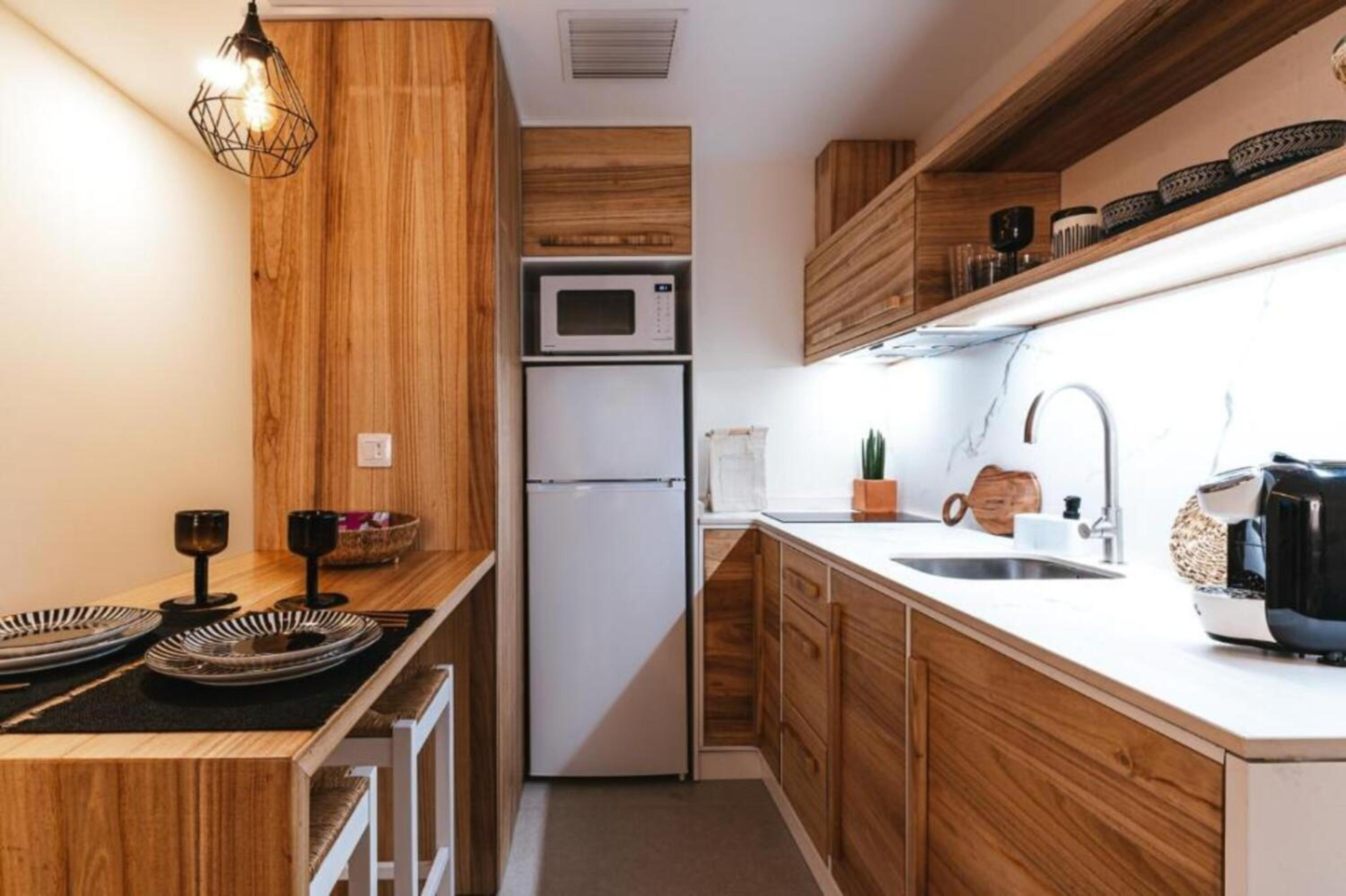 Die Küche ist komplett ausgestattet mit modernen Haushaltsgeräten wie Kühlschrank, Gefrierschrank, Waschmaschine, Ofen, Mikrowelle, Kaffeemaschine, Toaster, Wasserkocher, Entsafter und allen notwendigen Utensilien, um köstliche Mahlzeiten zuzubereiten. Darüber hinaus verfügt sie über WLAN-Verbindung und Fernsehen, um Sie während Ihres Aufenthalts zu unterhalten.